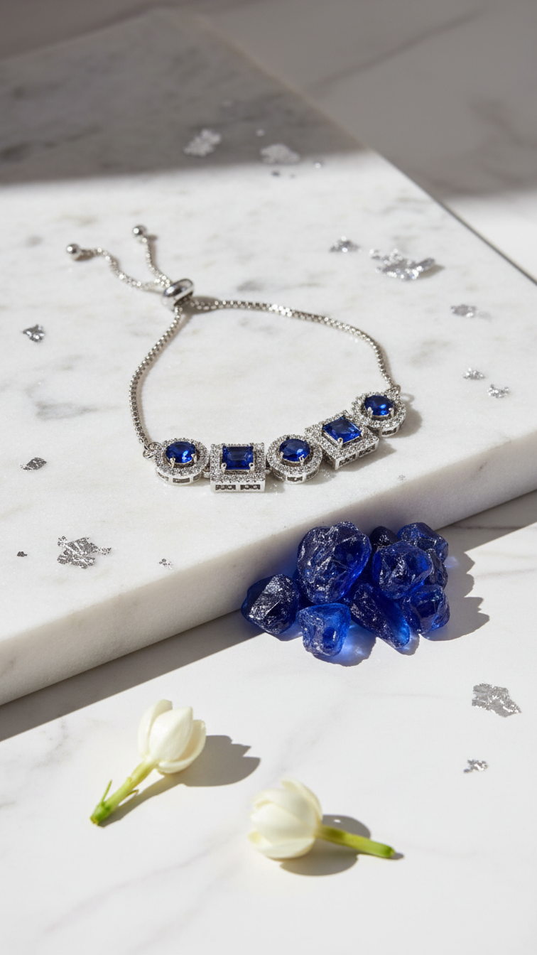 Elevate your jewellery collection with the refined charm of the Royal Blue Sapphire Crystal Adjustable Bracelet. Crafted with precision and designed for modern elegance, this bracelet showcases a sequence of radiant sapphire-blue crystals surrounded by shimmering zircon stones that enhance their brilliance.