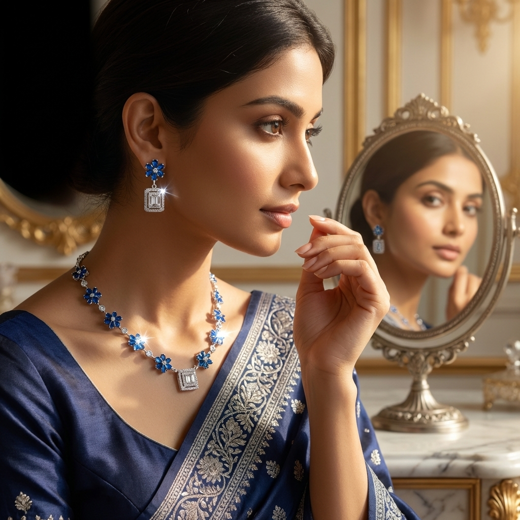 This blue American diamond floral set complements white linen sarees or flowy maxi dresses for garden parties, blue stones popping beautifully against neutral palettes. Style the necklace with off-shoulder blouses for casual brunches, stud earrings adding delicate sparkle. Perfect layered with pearl chokers for cultural events or minimalist necklines in cocktail attireβ€”floral cascade frames collarbones elegantly against both ethnic and western silhouettes.