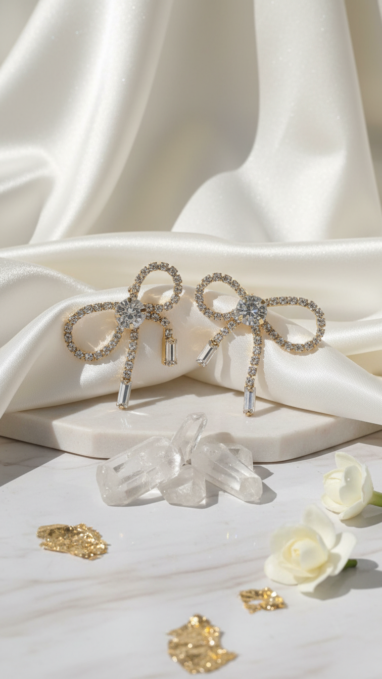 These crystal bow drop earrings pair beautifully with flowing silk sarees for bridal festivities, adding a touch of romantic whimsy. Style them with contemporary cocktail dresses for evening parties, where their sparkle enhances plunging necklines. Perfect for festive lehengas or Anarkali suits, they create balanced elegance; layer with minimalist studs for daily office wear or western gowns for high-glam events.